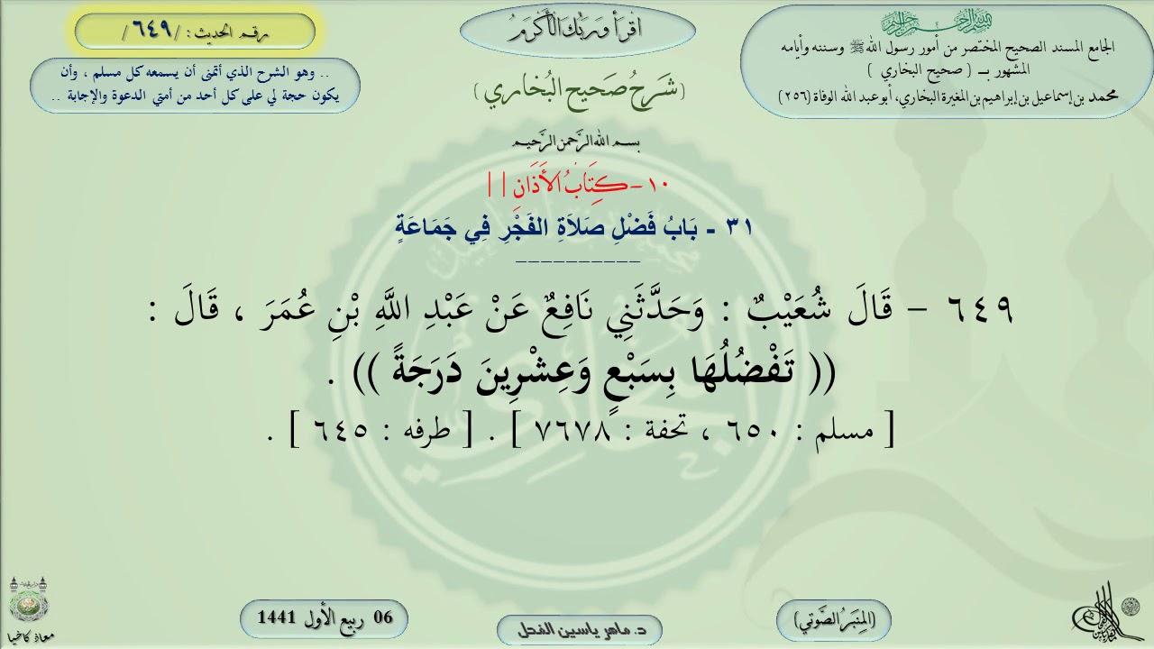 649 شرح صحيح البخاري باب فضل صلاة الفجر في جماعة الحديث 649 ماهر ياسين الفحل Youtube