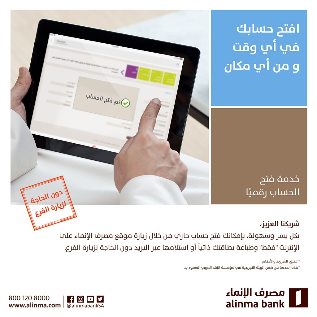 مصرف الإنماء در توییتر بكل يسر وسهولة بإمكانك فتح حساب جاري من خلال زيارة موقع مصرف الإنماء فقط وطباعة بطاقتك ذاتيا أو استلامها عبر البريد دون الحاجة لزيارة الفرع Https T Co Zciwaqjkgp