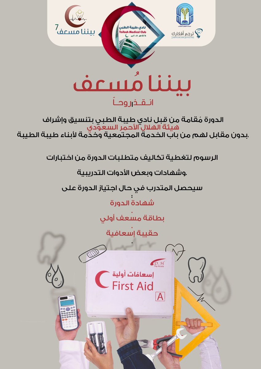 Tmc نادي طيبة الطبي On Twitter للتسجيل Https T Co Vp41kr1gkh الدورة معتمدة من ق بل الهلال الاحمر السعودي تفاصيل الدورة و شروط التسجيل في الصورة التالية Https T Co Gvahzy4yzl
