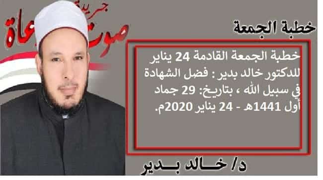 خطبة الجمعة القادمة 24 يناير للدكتور خالد بدير فضل الشهادة في سبيل الله صوت الدعاة أفضل موقع عربي في خطبة الجمعة والأخبار المهمة
