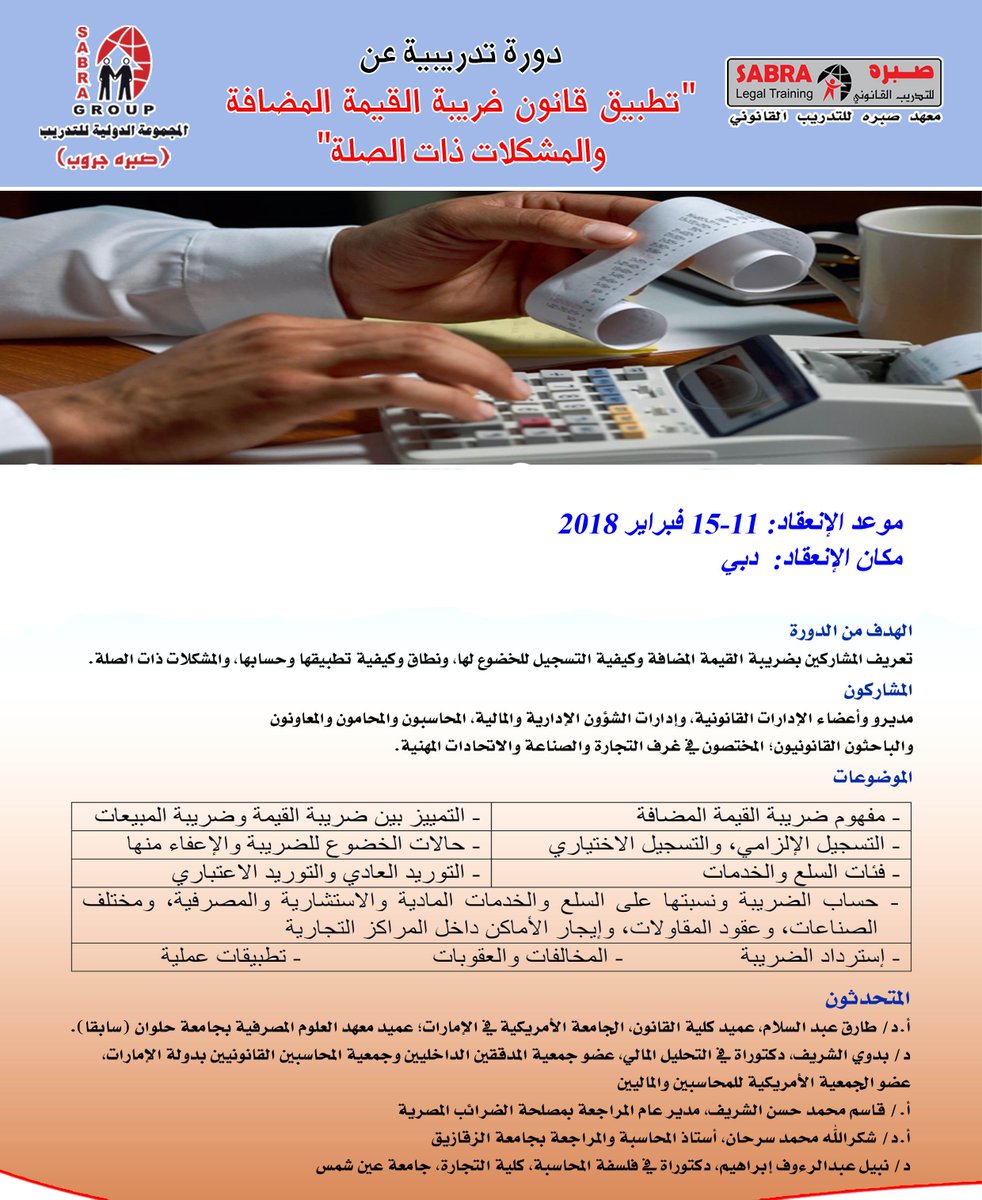 Sabra Legal Training A Twitter دورة تدريبية عن تطبيق قانون ضريبة القيمة المضافة والمشكلات ذات الصلة 11 15 فبراير 2018 دبي Https T Co Xt5gemt1xz Https T Co Rwpclry6hh