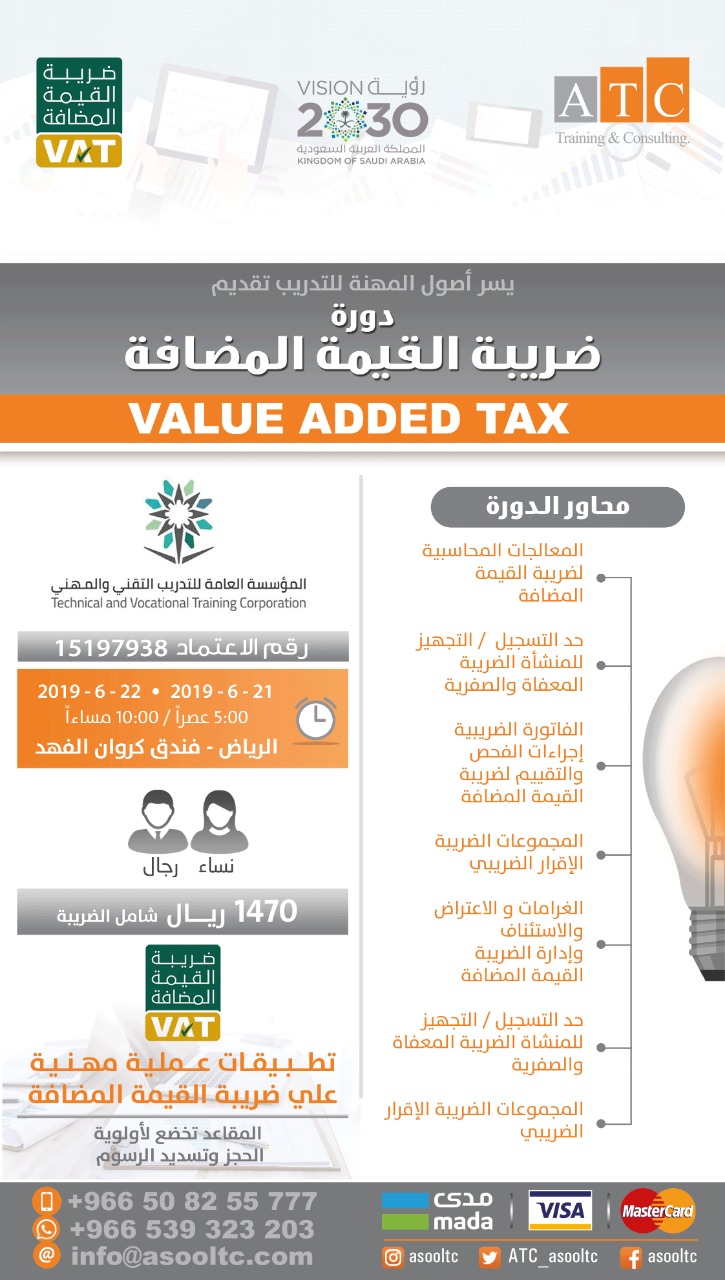هيئة المحاسبين On Twitter تعتزم هيئة المحاسبين عقد دورة تدريبية بعنوان ضريبة القيمة المضافة بمدينة الرياض و جدة و الدمام ولمدة ثلاثة أيام التفاصيل بالصور المرفقة التسجيل والسداد عن طريق الخدمات الإلكترونية Https T Co Lnf54snbby