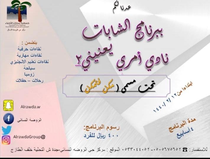 مركز حي الروضة En Twitter يقدم مركز حي الروضة النسائي برنامج الرائدات أمري يعنيني للشابات 2 تحت مسمى مكن فتمكن يتضمن سباحه زومبا ديكوباج وتتضمن دورات عديدة منها دورة للاسعافات الاولية