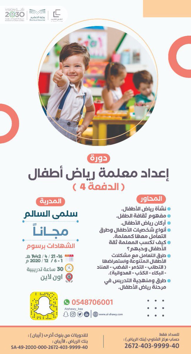مجموعة دورات الرياض On Twitter مجانا دورة إعداد معلمة رياض أطفال سلمى السالم ١٦ ٢١ ٤ ١٤٤٢ هـ الموافق ١ ٦ ديسمبر ٢٠٢٠ م مدة الدورة