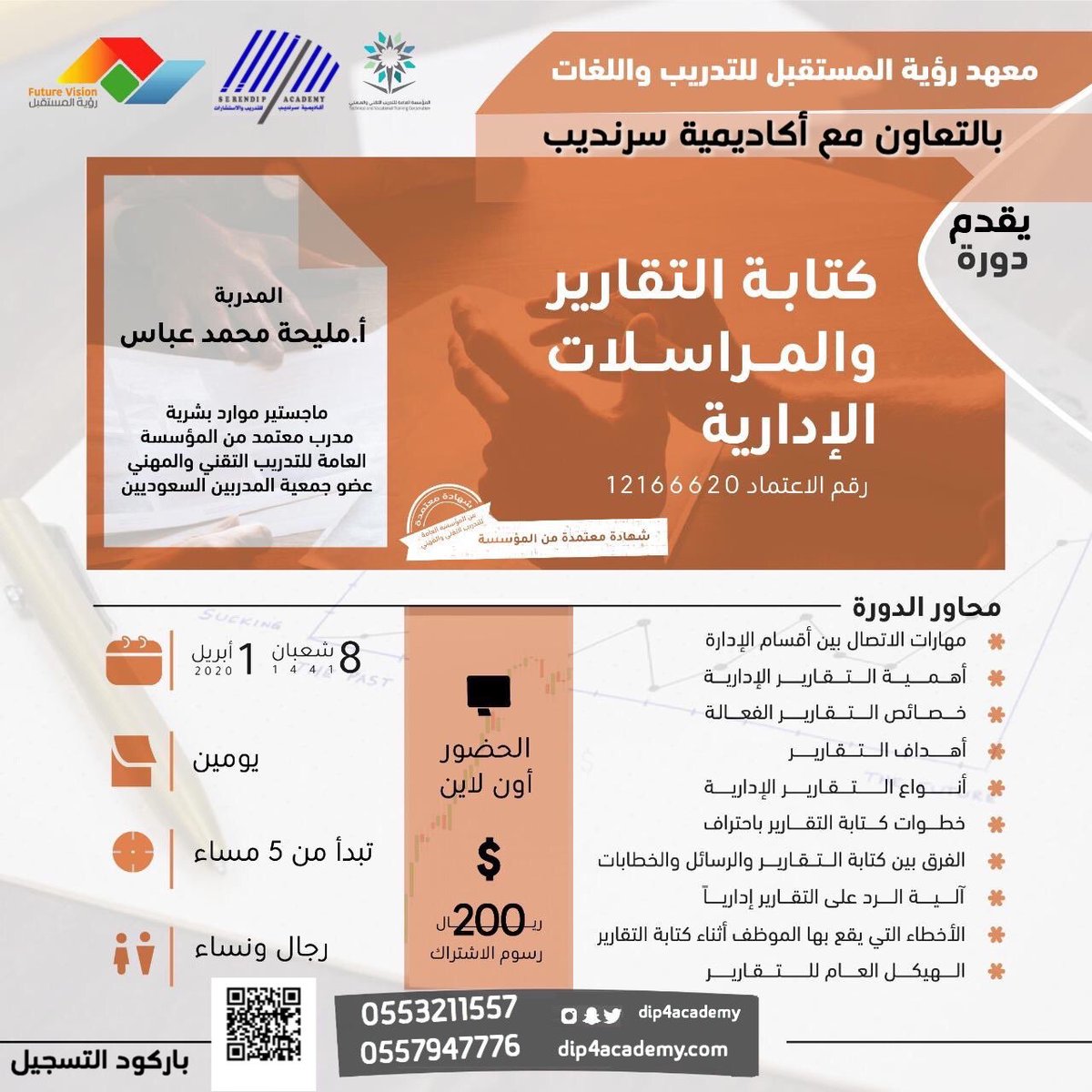 أكاديمية سرنديب On Twitter دورة كتابة التقارير والمراسلات الإدارية أونلاين وبشهادة معتمدة من المؤسسة العامة للتدريب التقني والمهني مع المدربة مليحة عباس الأربعاء 1441 8 8 الموافق 1 ابريل الساعة 5 00 م بتوقيت