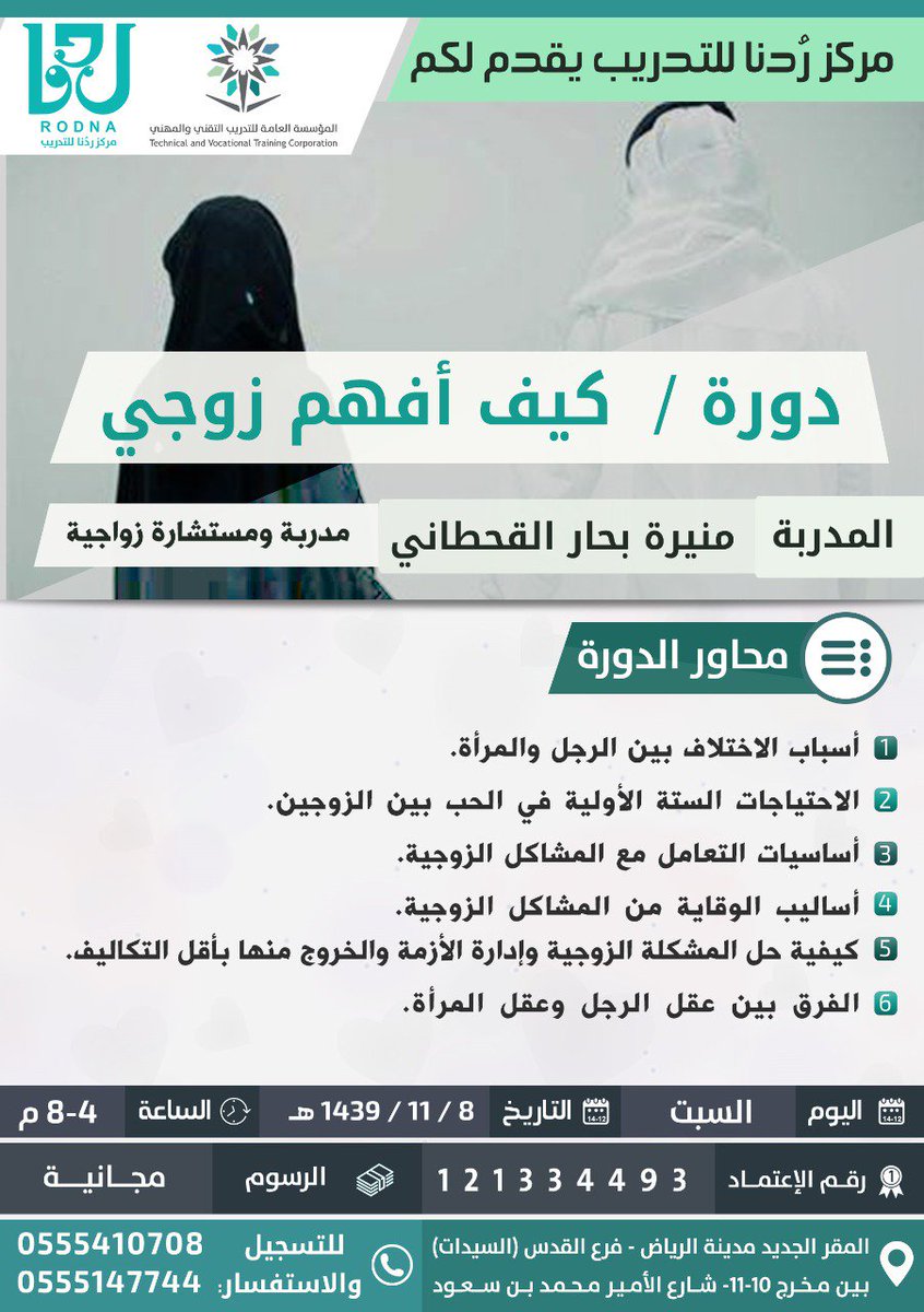 مركز ر دنا للتدريب على تويتر كيف أفهم زوجي تعرفي على أساليب استقرار الحياة الزوجية والتعامل الناجح مع الزوج لحياة زوجية سعيدة دورة دورات مركز تدريب معتمد