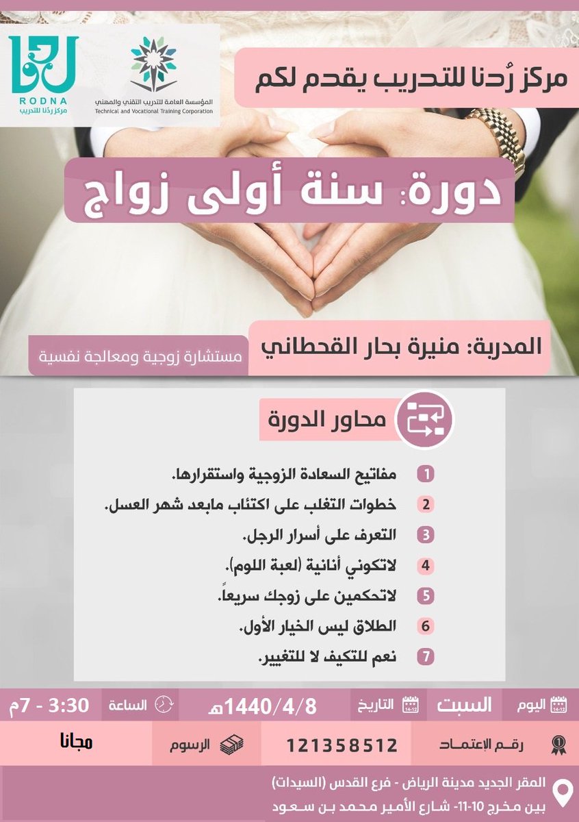 مركز ر دنا للتدريب Ar Twitter مركز ردنا للتدريب يقدم دورات مجانية في مجال الحياة الزوجية لحظات ذهبية لانعاش العلاقة الزوجية كيف أفهم زوجي سنة أولى زواج واتساب فقط