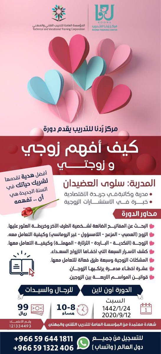 O Xrhsths مركز ر دنا للتدريب Sto Twitter يتشرف مركز ر دنا للتدريب بتقديم دورات في مجال الحياة الزوجية اونلاين دورة كيف أفهم زوجي مع المدربة د سلوى العضيدان للتسجيل واتساب Https T Co Twwefhohfo Https T Co Jjyummqzml تطوير اونلاين